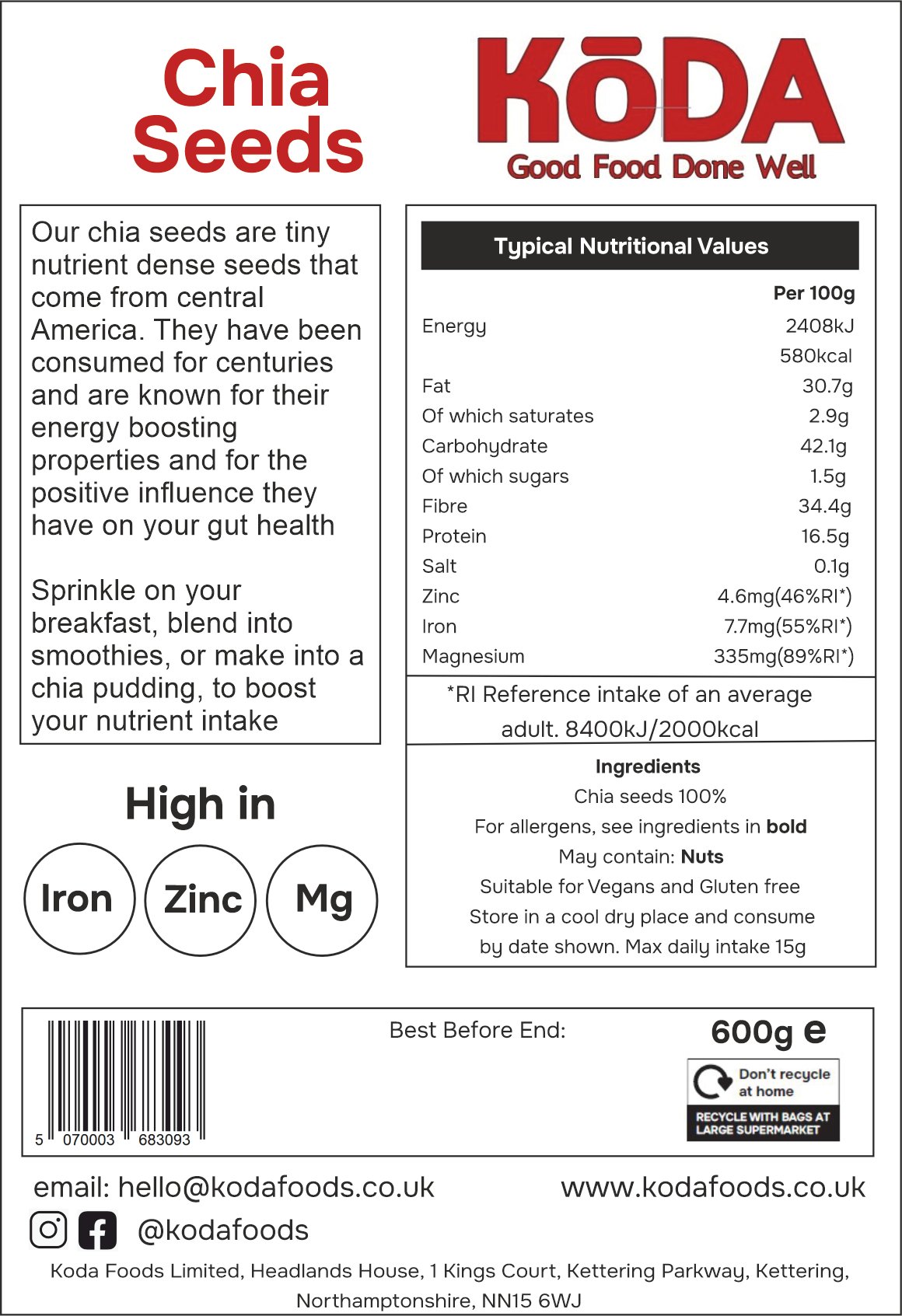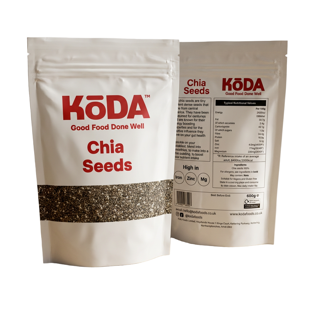• TINY BUT INCREDIBLY NUTRITIOUS: Koda Foods Chia Seeds are a true nutrient powerhouse. Packed with omega-3 fatty acids, dietary fibre, plant-based protein, antioxidants and calcium, they deliver exceptional nutritional value in every spoonful.